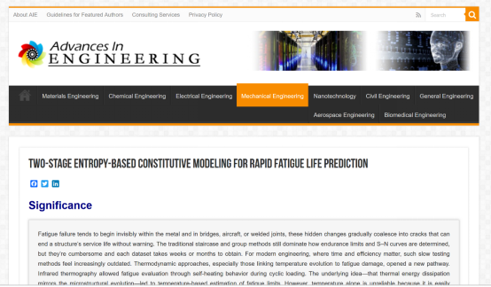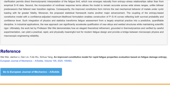 高熵合金焊接强韧化及疲劳评估团队魏巍老师发表在《European Journal of Mechanics–A/Solids》的论文被全球工程领域著名科技机构“Advances in Engineering(AIE)”遴选为“关键科学文章”,并以“Two-Stage Entropy-Based Constitutive Modeling for Rapid Fatigue Life Prediction”为题进行了报道。