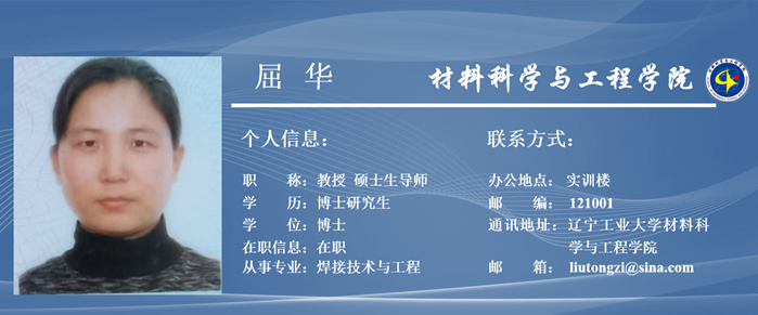 屈华,女,1972年生,辽宁沈阳人,博士,副教授,硕士生导师。2006年毕业于东北大学材料物理与化学专业,获博士学位。
