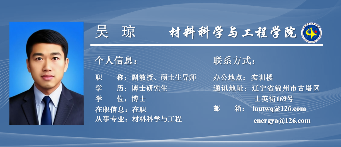 吴琼,材料科学与工程专业,博士,副教授,硕士生导师,中国化学会会员,美国陶瓷学会会员,美国电化学会会员,江苏省科技厅产学研专家、功能材料方面带头人,辽宁省“双百链接”专家,锦州优秀科技工作者,中国知网学位论文评审专家,中国国际大学生创新大赛评审专家,Journal of Energy Chemistry,Energy Materials,Rare Metals,Communications Chemistry,Ceramics International,Applied Surface Science,Journal of Alloys and Compounds, Nanoscale Horizons,Dalton Transactions,Electrochemistry Communications,Nanoscale,Journal of The Electrochemical Society等国际期刊的编委或审稿专家。主要从事新能源储能材料、电接触材料、金属离子电池、超级电容器等的研发与应用。