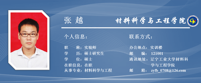 张越,男,1987 年生,辽宁兴城人,硕士,实验师,现任材料科学与工程实验中心主任,主管材料分析测试中心。一直从事材料的分析与表征及金属构件的失效分析等方面的研究工作。近年来,先后主持辽宁省教育厅科学研究项目、企业横向课题各1项。作为主要完成人参与国家自然科学青年基金项目2项;辽宁省教育厅科学技术研究项目1项;中国科学院兰州化学物理研究所固体润滑国家重点实验室开放课题项目1项;河南科技大学高端轴承摩擦学技术与应用国家地方联合工程实验室开放基金项目1项。近三年来合作发表学术论文10余篇,申请发明专利2项,授权实用新型专利2项。