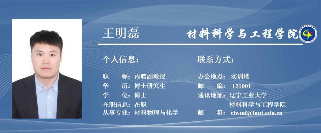 王明磊,男,1990年生,辽宁朝阳人,博士研究生,研究生导师。博士就读于大连理工大学材料科学与工程学院。主持和参与国家高技术研究发展技术(“863计划”)项目、中航航发北京航空材料研究院项目、辽宁省菱镁矿高值利用工程研究中心项目、校博士启动基金、横向课题等项目6项。在Diamond and Related Materials、Rare Metal Materials And Engineering、Plasma Science and Technology、Journal of Materials Research and Technology、 Journal of Inorganic Materials等期刊发表SCI检索论文6篇。