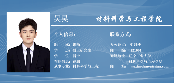 吴昊,男,1991年生,辽宁锦州人,博士,讲师。参与国家自然科学基金项目、澳大利亚Wollongong 大学合作项目等项目3项。在Calphad、Procedia Engineering、Journal of Alloys and Compounds等国内外期刊上发表论文4篇。申请发明专利3项。